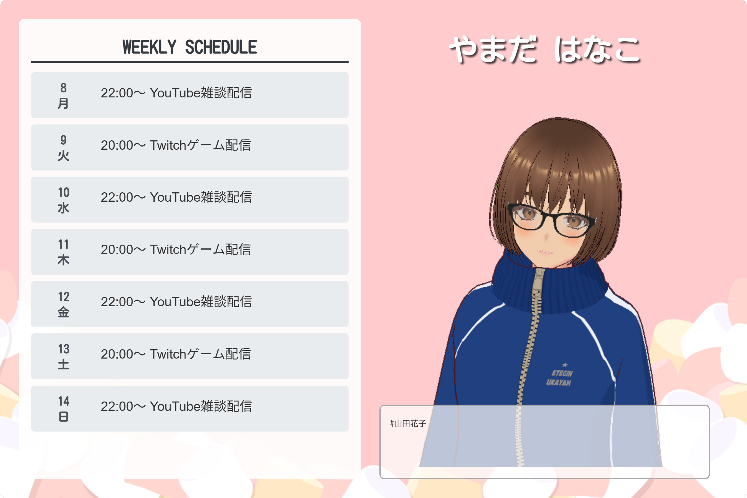 特徴: 週間スケジュールに特化した多機能ジェネレーターです。テンプレートを選べるだけでなく、配信タイトル、使用するハッシュタグ、曜日ごとの背景画像まで細かく設定できます。デザイン性が高く、個性的なスケジュール表を作成したいVTuberさんに人気の高いツールです。